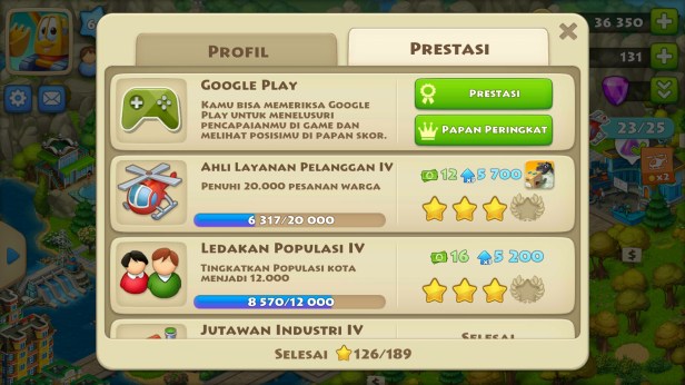 Pada tampilan ‘Profil’ ini terdapat informasi tentang walikota (level, nama kota, nama koperasi, gambar profil) dan pencapaian yang telah dicapai seperti berapa banyak pesanan helikopter telah terisi atau pesawat yang terisi penuh telah terkirim.
